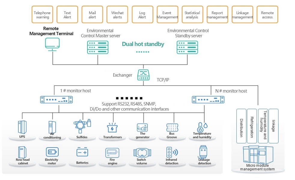 Active loop monitoringThe DCIM platform enables centralized management and integration of subsystems such as UPS, low-voltage PDC, precision head cabinet, battery set, generator set, temperature and humidity monitoring, cabinet microenvironment, water leakage monitoring, and fire control monitoring on a unified management platform to truly share data. At the same time, the video surveillance system, access control management system, anti-theft alarm system, BA automatic control system, etc. are integrated, and the above systems are monitored, searched, linked and generated reports in the big dynamic ring platform.