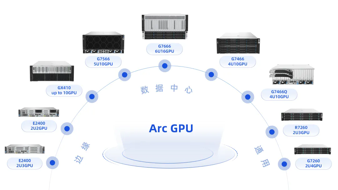 云尖信息主流機型已適配Arc GPU系列GPU卡全線覆蓋2U、4U、5U、6U形態,支持1~16張GPU卡。