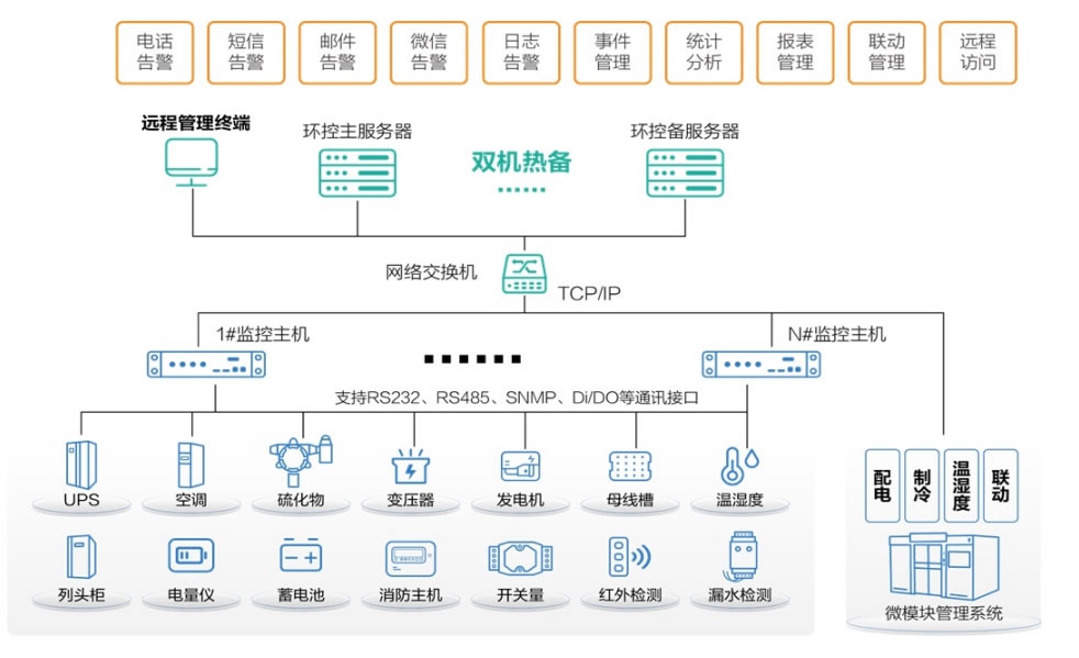 動環監控通過DCIM平臺對實現UPS設備、低壓配電柜、精密列頭柜、蓄電池組、發電機組、溫濕度監測、機柜微環境、漏水監測、消防監測等子系統在統一的管理平臺上進行集中管理及集成,真正做到數據共享。同時對視頻監控系統、門禁管理系統、防盜報警系統、BA自控系統等進行集成,在大動環平臺內對上述系統進行實時監測、查詢、聯動、生成報表。