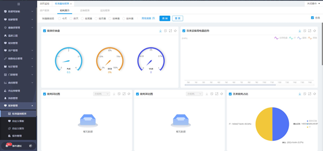 能效管理數據中心能源管理主要作為整體機房能耗評估的重要依據,為實現機房內的能源管理、能源分配、能耗計算、能源節約的指標化。完善機房能源基礎數據體系,為用戶建立一套科學完善的能源利用監督、管理、評價體系,包括能源設備管理、能耗值計算、能耗報表、預測分析等。