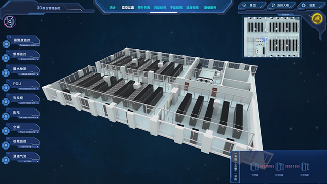 3D可視化采用最新的3D圖形技術,實現對項目范圍內的所有資產對象的虛擬仿真,以完全3D模式構建整個數據中心環境,系統的設計需靈活易用,界面簡潔美觀;實現數據中心所在建筑外觀、數據中心所在樓層及數據中心內部環境的虛擬仿真,3D建模的結果需要與真實環境一致,包括結構、尺寸,以及內部的裝修風格等。